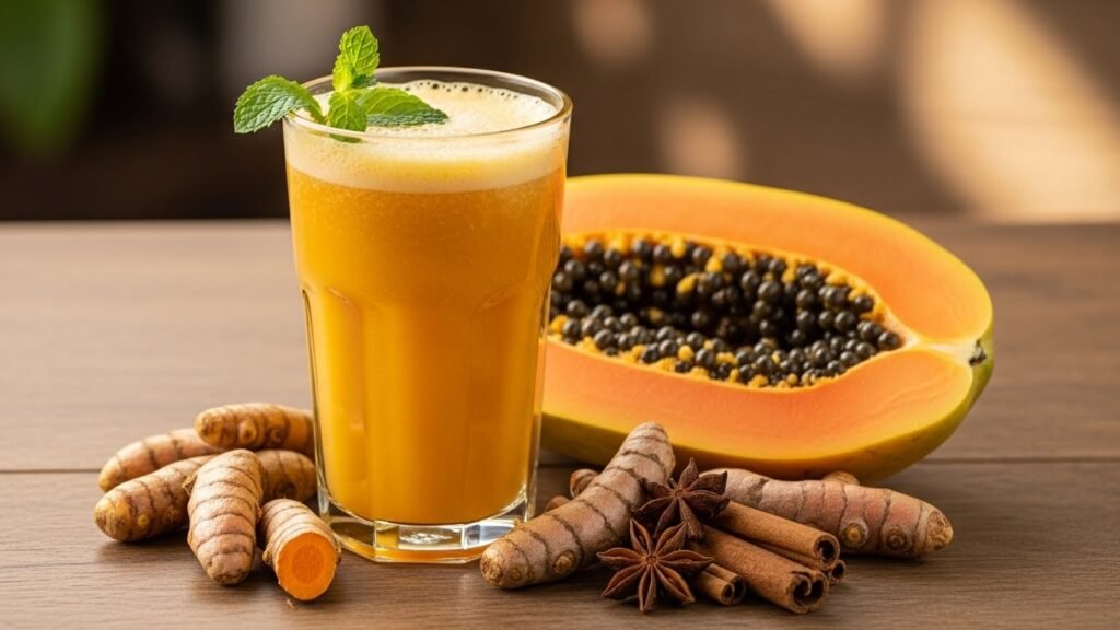 - Recipe: 1/2 small Papaya (peeled), 1/2 inch fresh Turmeric root, 1 Orange.